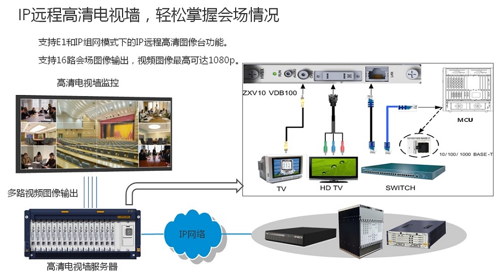 本項目視頻會議系統解決方案以電信級智能視訊服務器(MCU)設備M9000C為核心,與高清視頻會議終端XT802、ET701C組成完成的視頻會議系統。該系統可進行遠程會議、遠程教育、職業培訓、協同工作、遠程管理與監督等應用。