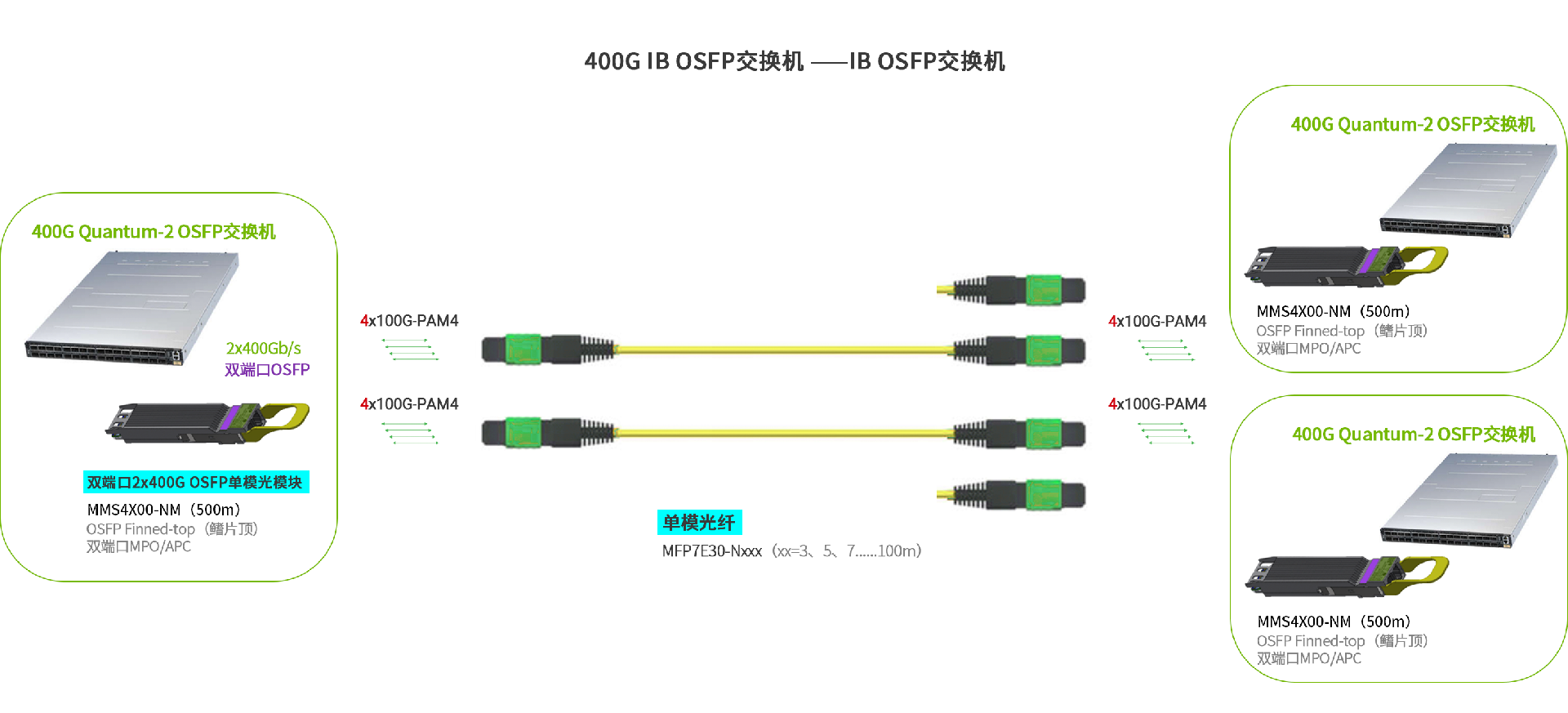 NVIDIA/Mellanox MMS4X00-NM 是一款 InfiniBand (IB) 和以太網 (ETH) 2x400Gb/s 雙端口 OSFP、DR8單模、并行8 通道收發器,使用兩個 4 通道 MPO-12/APC 光纖連接器,每個連接器速度為 400Gb/s,采用 100G-PAM4 調制,最大傳輸距離500 米。主要用于Quantum-2 InfiniBand交換機之間最遠500m距離互連。