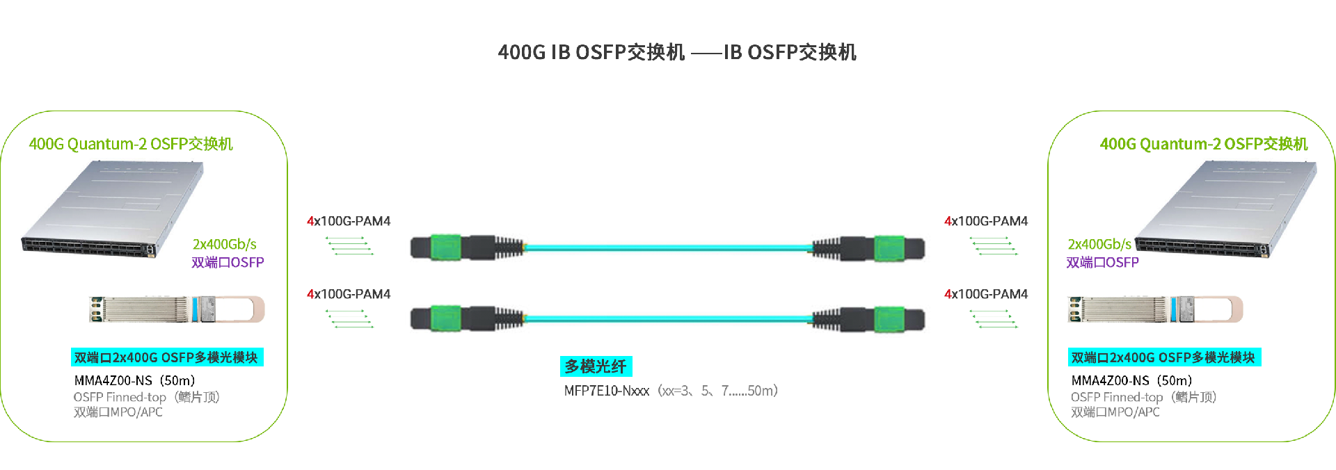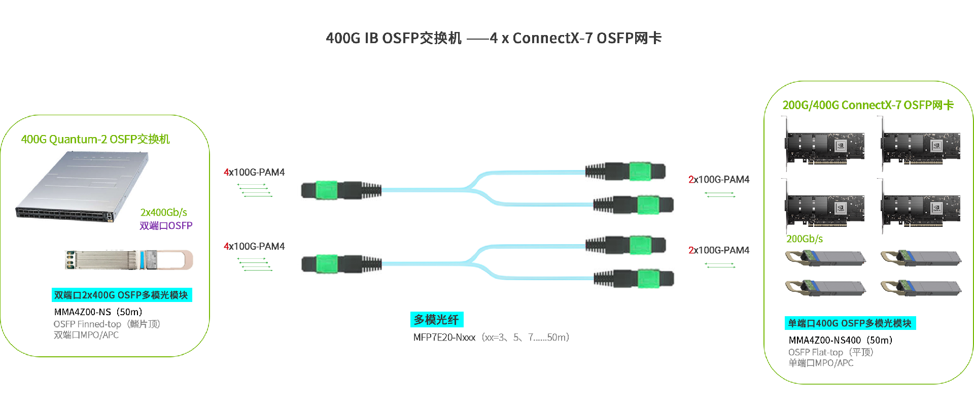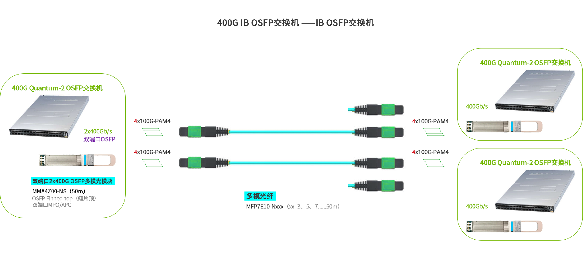 NVIDIA/Mellanox MMA4Z00-NS 是一款InfiniBand和以太網 800Gb/s 2x400Gb/s 雙端OSFP、2xSR4多模,每通道速率為400Gb/s,使用8 根多模光纖,最大光纖傳輸距離為50米的光模塊。主要用于Quantum-2InfiniBand 到兩個400Gb/s ConnectX-7 OSFP網卡。