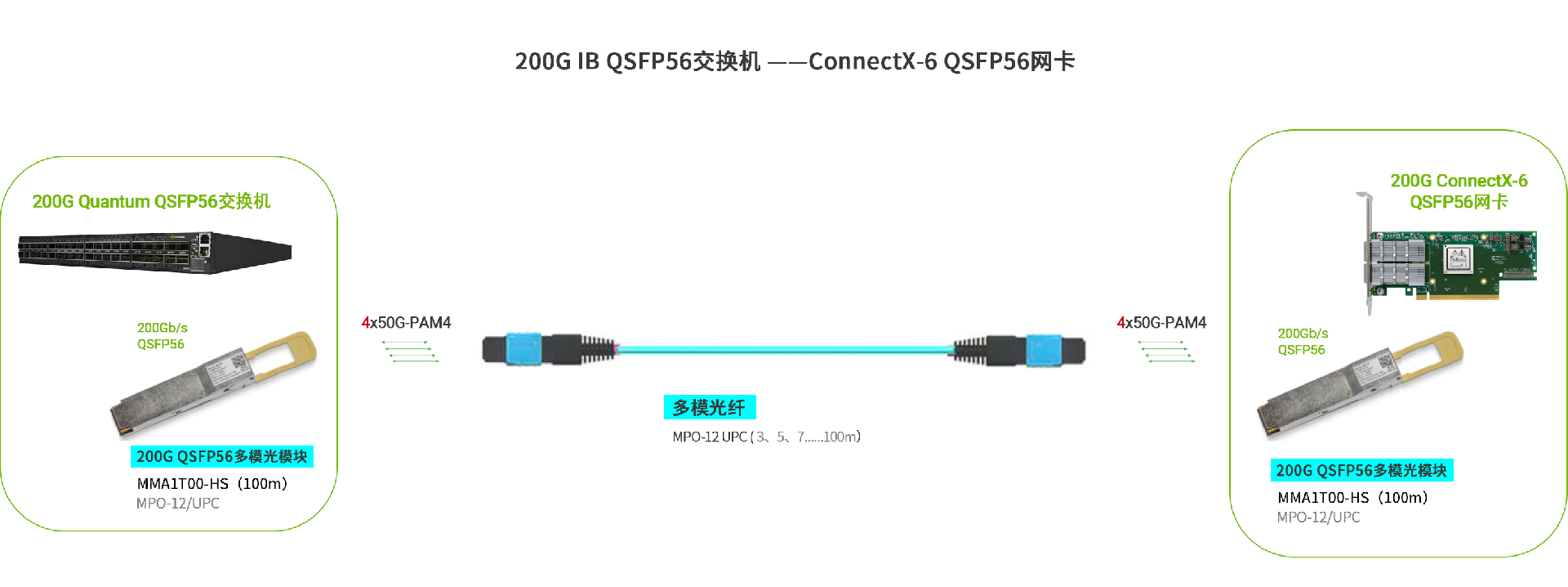 NVIDIA/Mellanox MMA1T00-HS 熱插拔 QSFP56 光模塊可通過 MPO 連接器使用 850nm 波長的多模光纖 (MMF) 實現高達 100m 的傳輸距離,支持 200Gb/s InfiniBand HDR 系統或 200G 以太網,主要用于 QM8700/QM8790交換機以及200G ConnectX-6 QSFP56 網卡。