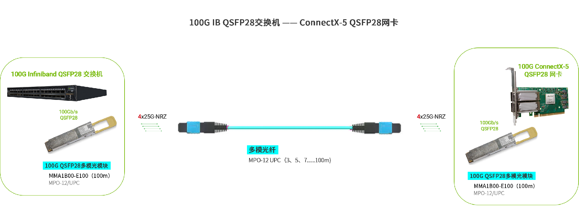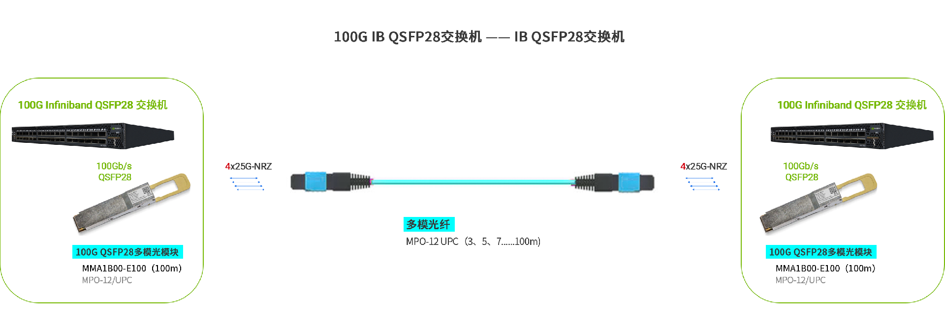 NVIDIA/Mellanox MMA1B00-E100 是一款 4 通道、可插拔、QSFP28 光收發器,設計用于100Gb/s EDR InfiniBand 系統。 該模塊采用 Mellanox 集成電路技術,以低功耗提供高性能。 收發器在并行多模(MMF) 光纖上工作,使用 850nm 的標稱波長,傳輸100m的距離,主要用于EDR InfiniBand 交換機與100Gb/s ConnectX-5 QSFP28 網卡互連。