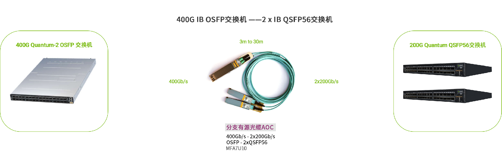 NVIDIA/Mellanox MFA7U10 是一款 OSFP 到 2x QSFP56有源分支線纜 (AOC),主要用于將帶有 OSFP NDR 交換機連接到傳統的 HDR 交換機或者是QSFP56 網卡 。